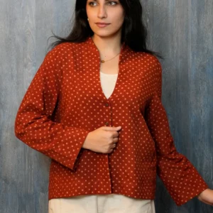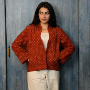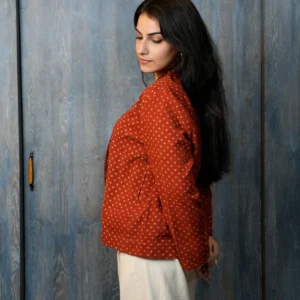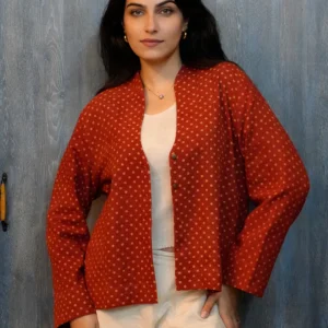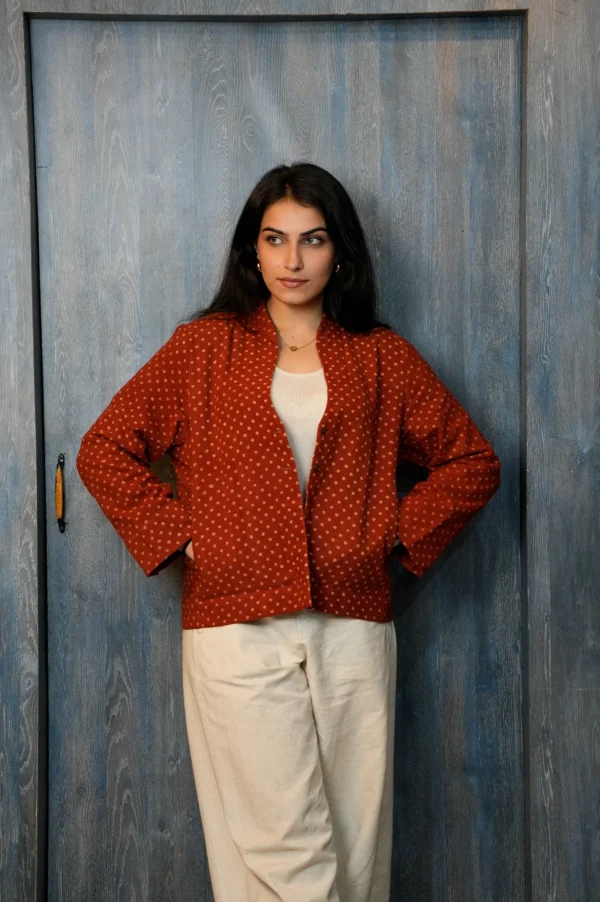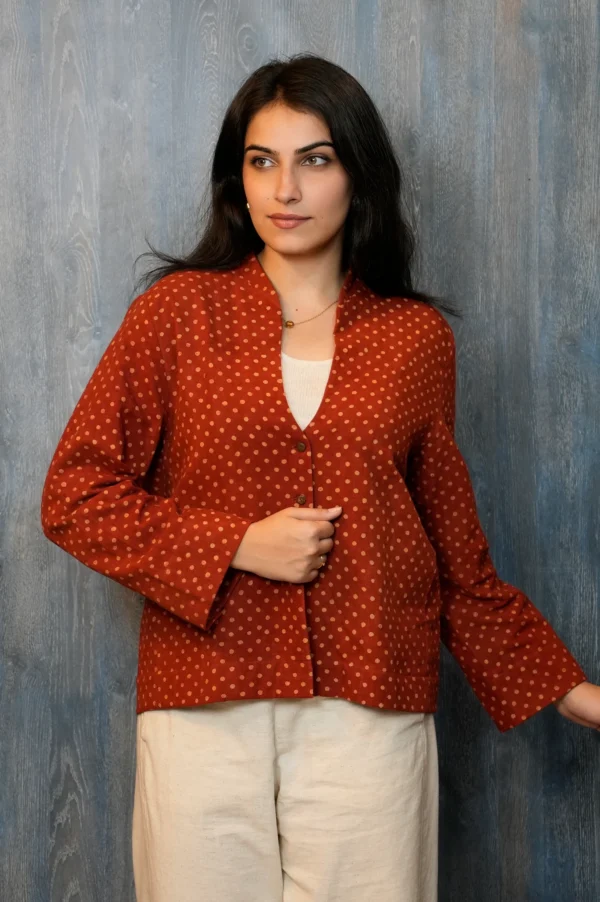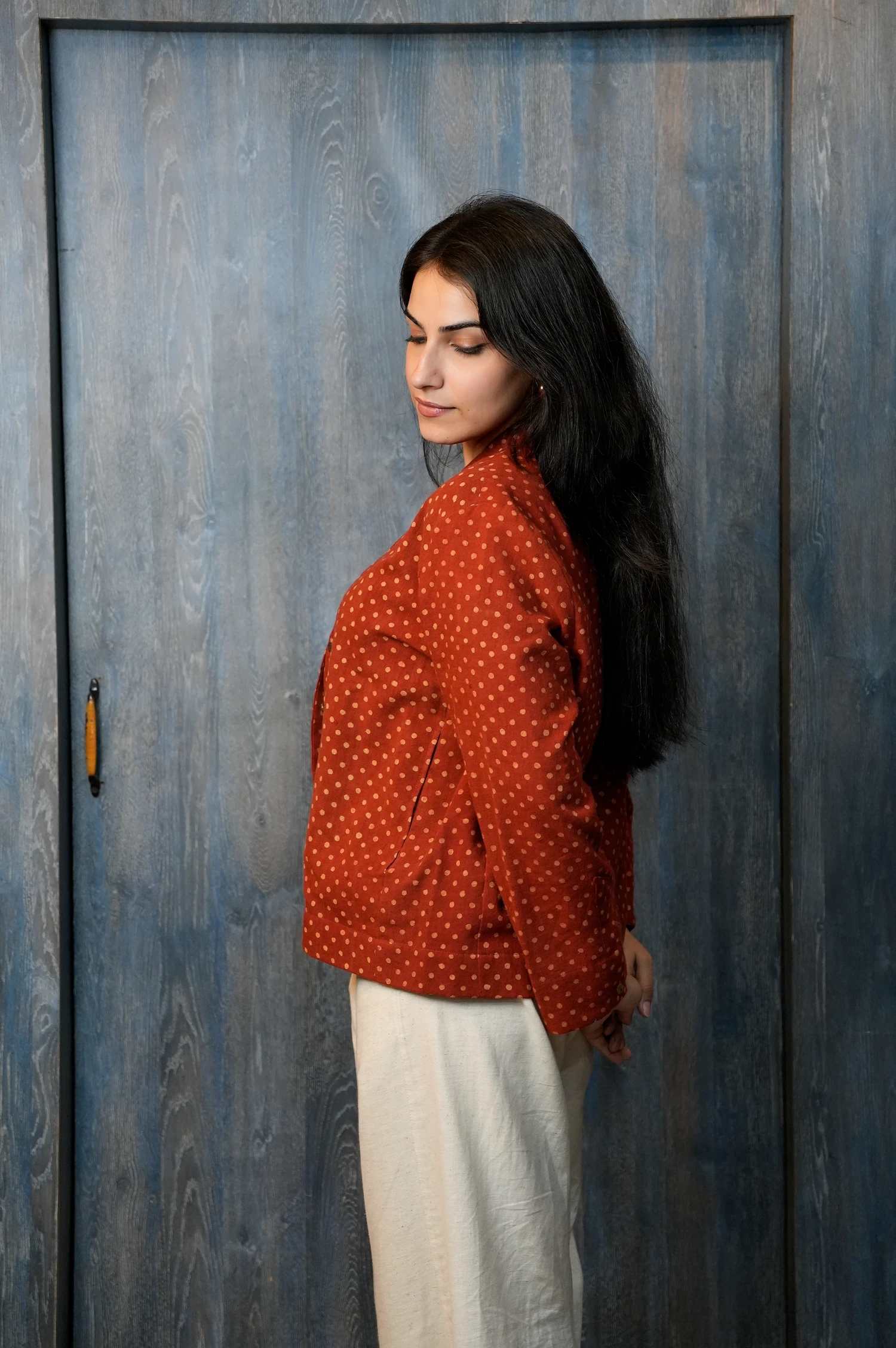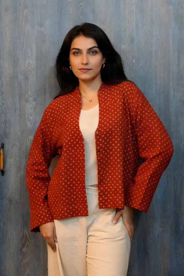 It features a rich deep red-brown color with an all-over Ajrakh print of small, uniform ochre dots. The jacket has a neat, slightly cropped silhouette and a clean band collar. It closes with a simple button-down placket, and its long sleeves have a comfortable, relaxed fit.