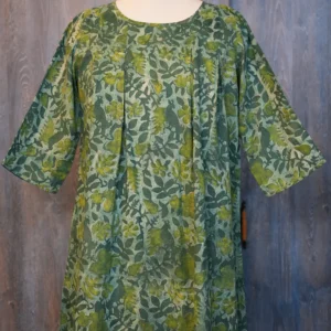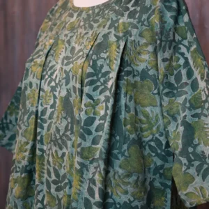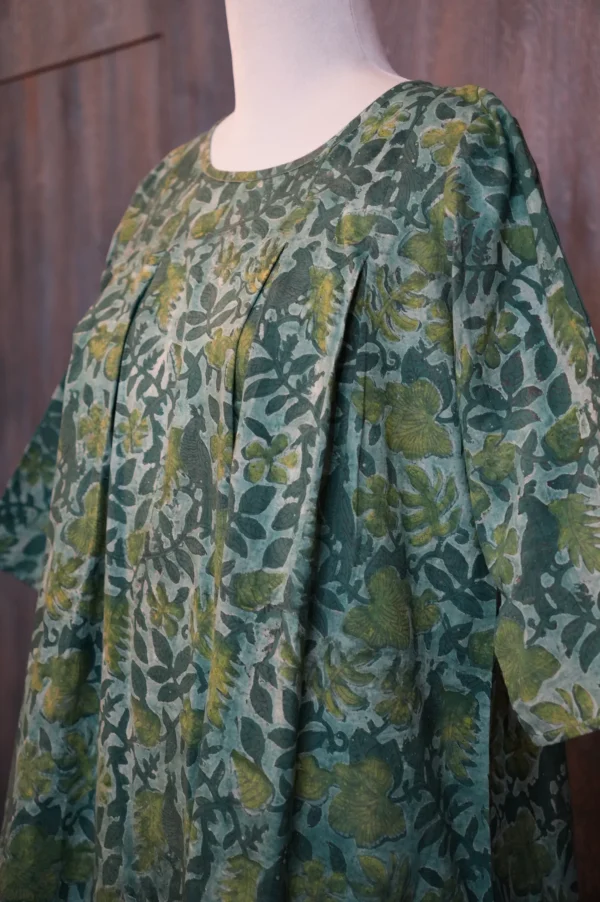 Embrace the beauty of nature with this exquisite block print dress. Adorned with a lush, botanical pattern in varying shades of green, this dress is a testament to the artistry of hand-stamped textiles.