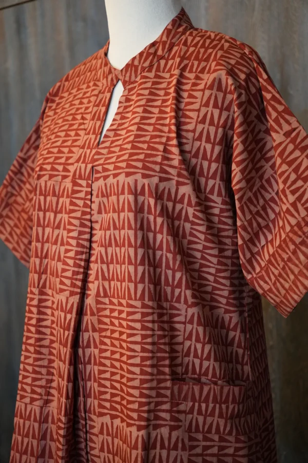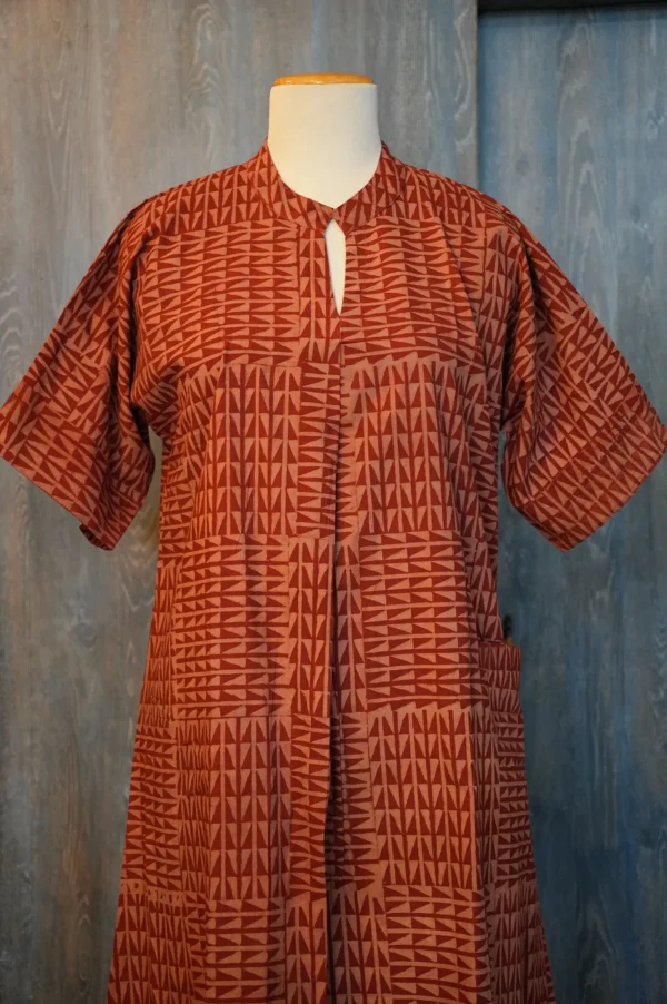 Embrace a blend of traditional artistry and modern elegance with this unique block print dress. The rich, earthy rust hue is adorned with an intricate geometric pattern, each motif meticulously hand-stamped for a truly one-of-a-kind look.