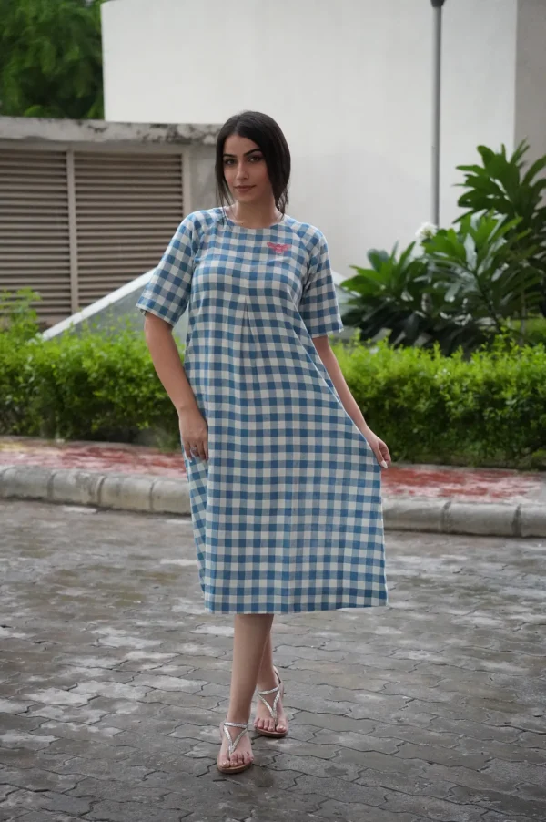 Straight-Fit Handwoven Cotton Blue And White Checkered Dress
