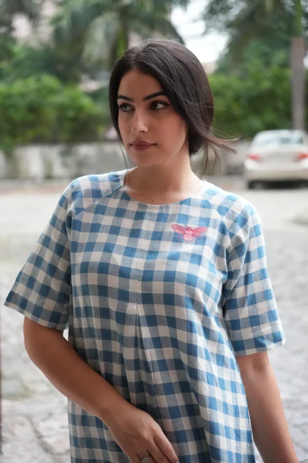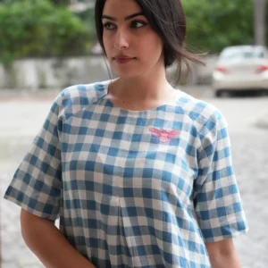 Crafted from a soft, breathable cotton fabric, it features a timeless blue and off-white checkered pattern that drapes gracefully for a relaxed yet flattering fit. The subtle pleated detailing at the neckline adds a touch of sophistication, while the short sleeves make it ideal for warmer days.
