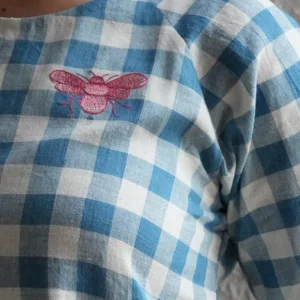 The true highlight of this piece is the delicate, embroidered motif located just below the collar, adding a unique and artisanal touch that sets this dress apart. Whether you’re enjoying a casual day out, a weekend brunch, or simply seeking comfort at home, this versatile dress combines classic style with thoughtful details.